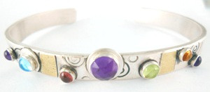 This 6mm wide cuff is made of sterling and fine silver with 18kt gold and seven stones, the main one being a 6mm rose facet stone, either amethyst, citrine, or blue topaz. The words “Protect this Woman” are stamped on the back.