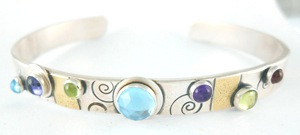 This 6mm wide cuff is made of sterling and fine silver with 18kt gold and seven stones, the main one being a 6mm rose facet stone, either amethyst, citrine, or blue topaz. The words “Protect this Woman” are stamped on the back.